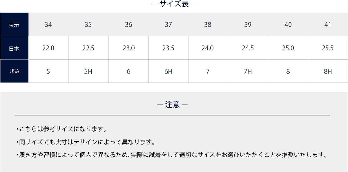 A.パンプスやヒールなど種類やデザインによって変わってくるので、サイズはあくまで目安として実際に試着をお勧めいたします。