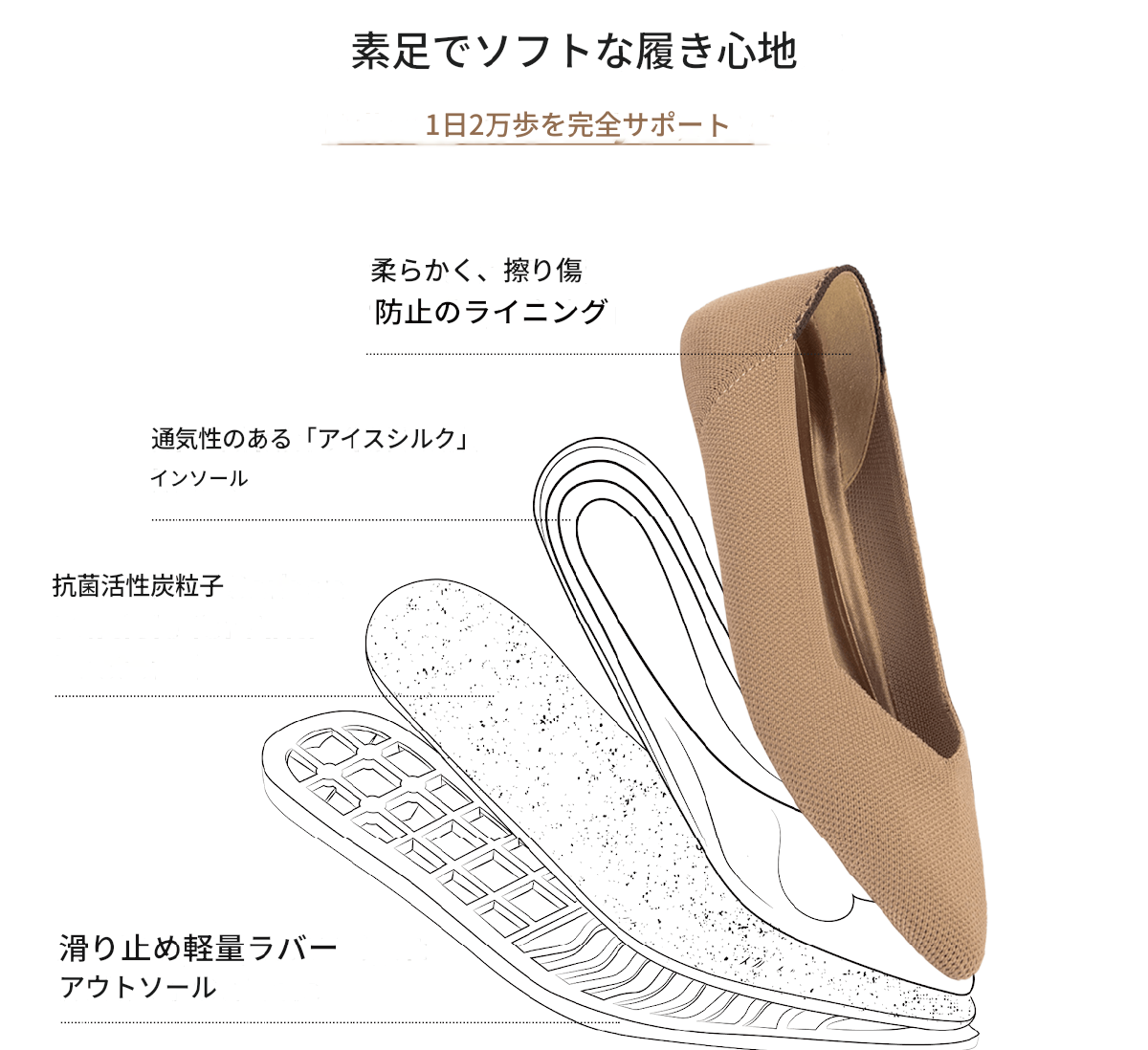 A.インソール部分が衝撃吸収設計されており、長時間履いても疲れにくくなっています。